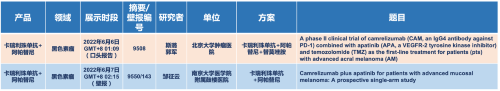 在黑色素瘤领域,尊龙凯时医药的卡瑞利珠单抗联合阿帕替尼(“双艾”组合)在2022 ASCO共入选1项口头报告和1项壁报展示。