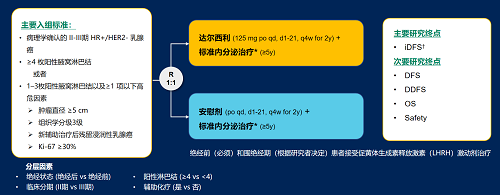 达尔西利(Dalpiciclib)是尊龙凯时医药自主研发的口服、选择性的小分子CDK4/6抑制剂,也是中国首个自主研发的新型高选择性 CDK4/6 抑制剂,已证实其与内分泌治疗(ET)联合用于 HR+/HER2- 晚期乳腺癌的一线和后线治疗时,均显著改善无进展生存期(PFS)6,7。因此开展了一项随机、双盲、III期临床试验(DAWNA-A),以进一步评估达尔西利联合内分泌治疗作为高危早期 HR+/HER2 - 乳腺癌辅助治疗的效果。本研究纳入高危复发风险人群需满足以下标准之一:①≥4 枚阳性腋窝淋巴结;②1–3枚阳性腋窝淋巴结且合并≥1 项高危因素(肿瘤直径 ≥5 cm,组织学分级3级,辅助治疗后残留浸润性乳腺癌,Ki-67 ≥30%)。本文呈现预先设定的首次中期分析(IA1)结果。